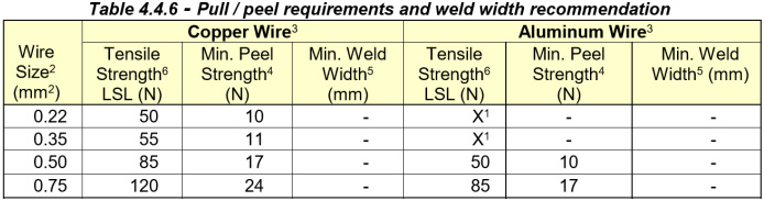 此表格為USCAR38-1拉力撕拉力標(biāo)準(zhǔn)。實際生產(chǎn)時,拉力應(yīng)達(dá)到該標(biāo)準(zhǔn)的2倍以上,底線為該標(biāo)準(zhǔn)的1.5倍。